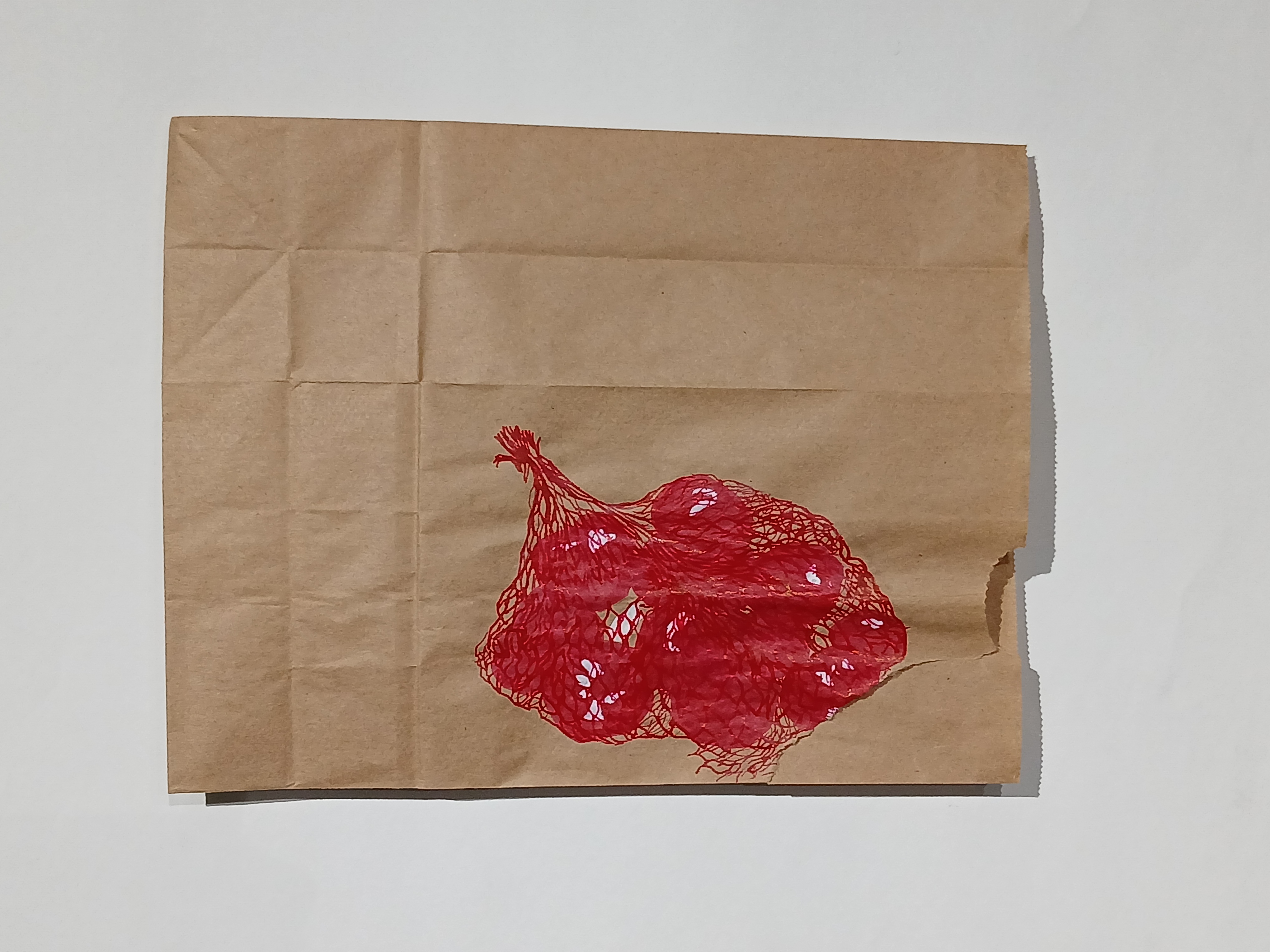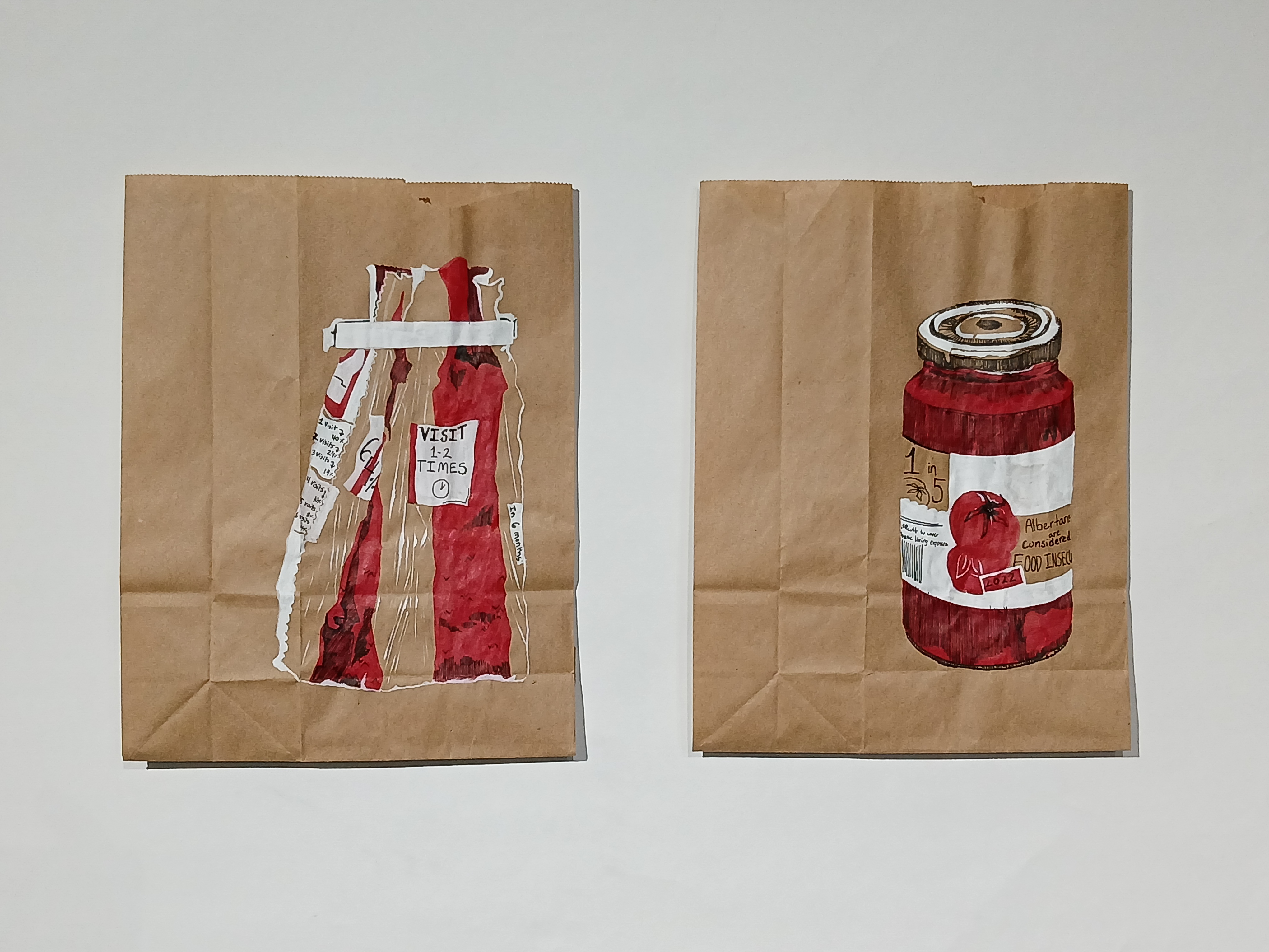 The body of work explores imagery from my personal pantry, 2022 statistics from the Red Deer Food Bank, and found grocery material. Through paper bags, I consider the relationship between grocery shopping, in-store donations, and what composes a meal. I look to my own pantry, paralleling the most requested donation staples. I became intrigued by the pattern of tomato net bags; connecting it to the development of an indoor cherry tomato greenhouse at the Food Bank supported by Co-Op.