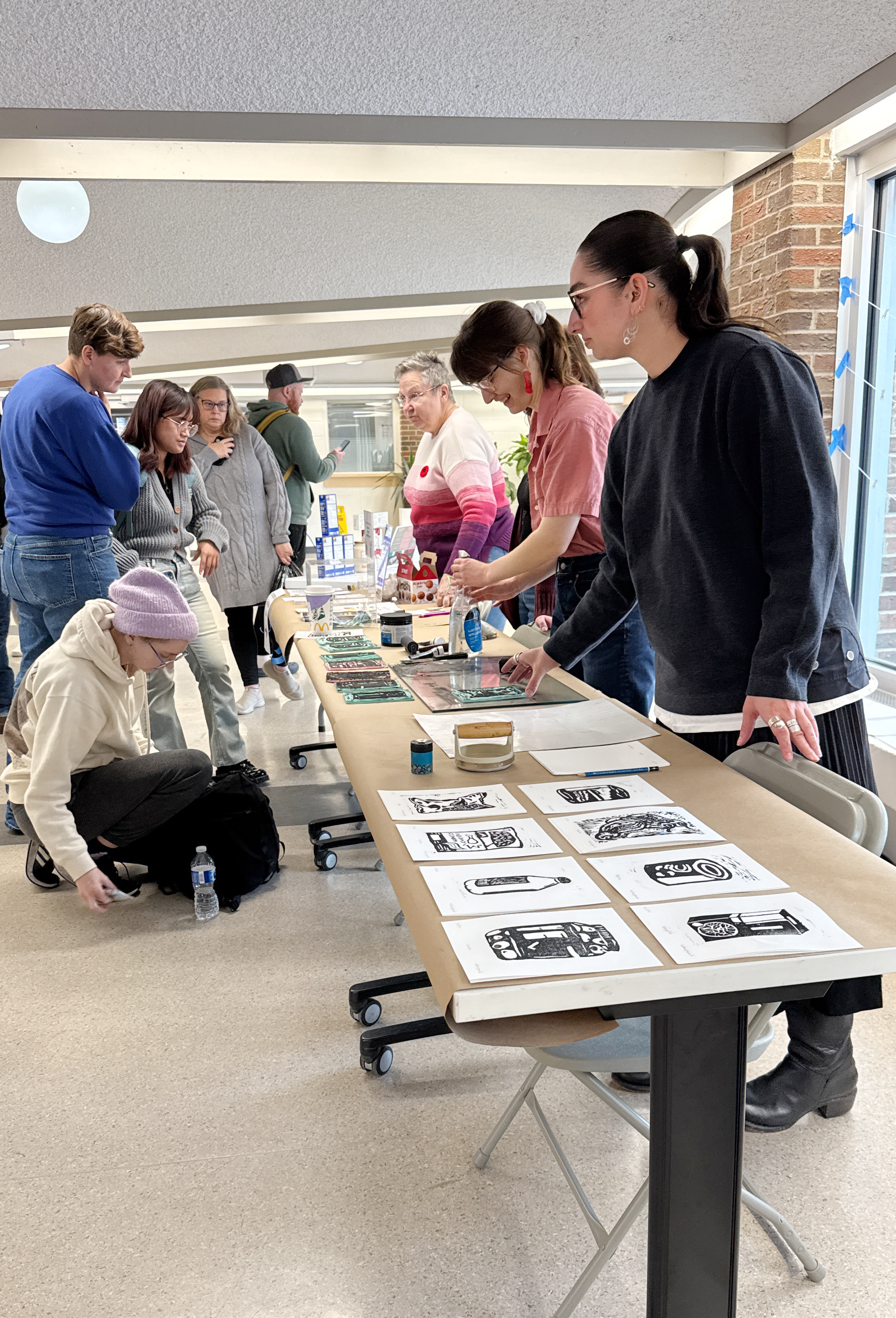 On Nov 22nd, 2024, I worked with volunteer artists and the Red Deer Food Bank to host a live printing event in the RDP Forum. Members of the public could take a print in exchange for taking the time to learn about the services Red Deer Food Bank offers to the community, or donations to support the cause. Our goal was to create a way for members of our community to engage with the Food Bank regardless of their ability to donate.